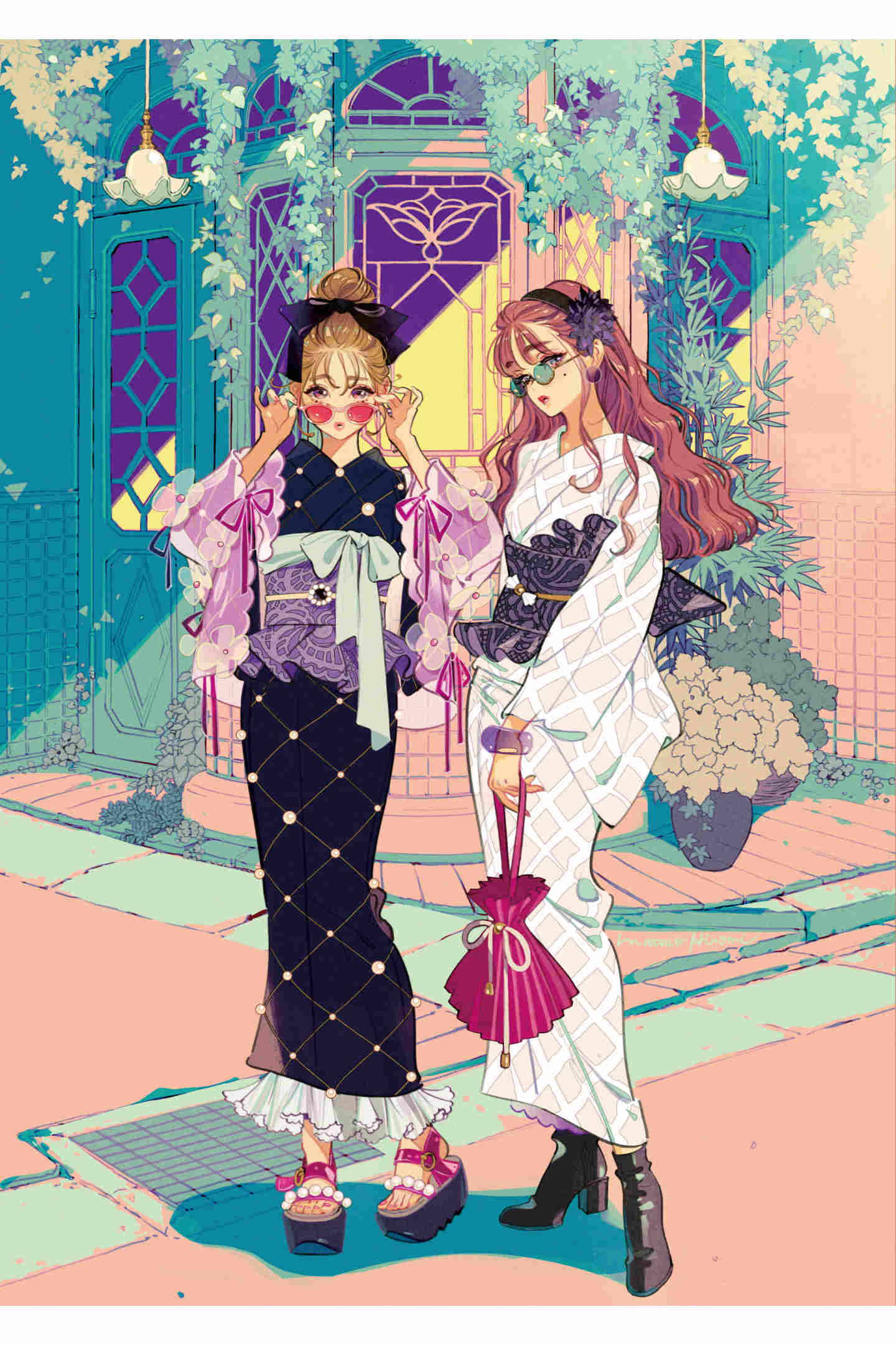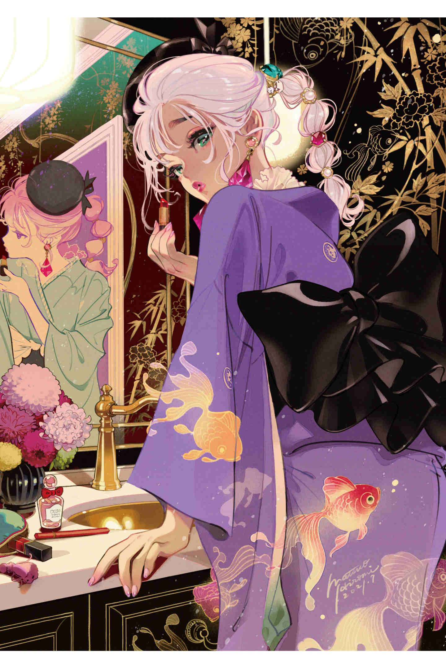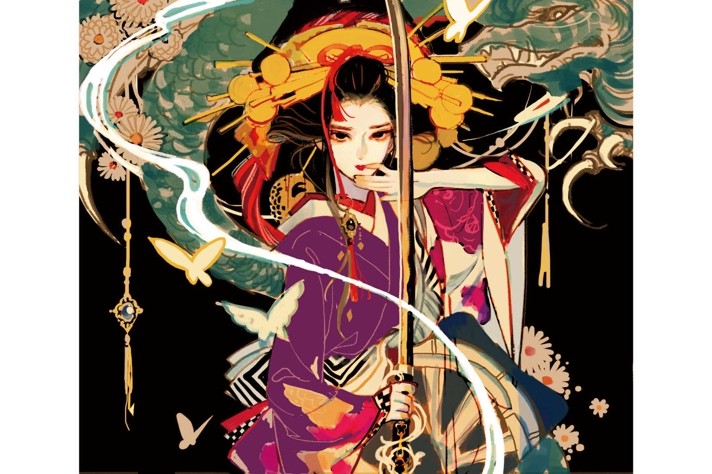 細部までこだわり抜いて描かれる着物のデザインや装飾、煌びやかな衣装に飾られた女性たちからは、かわいらしさであったりミステリアスな雰囲気を感じられます。