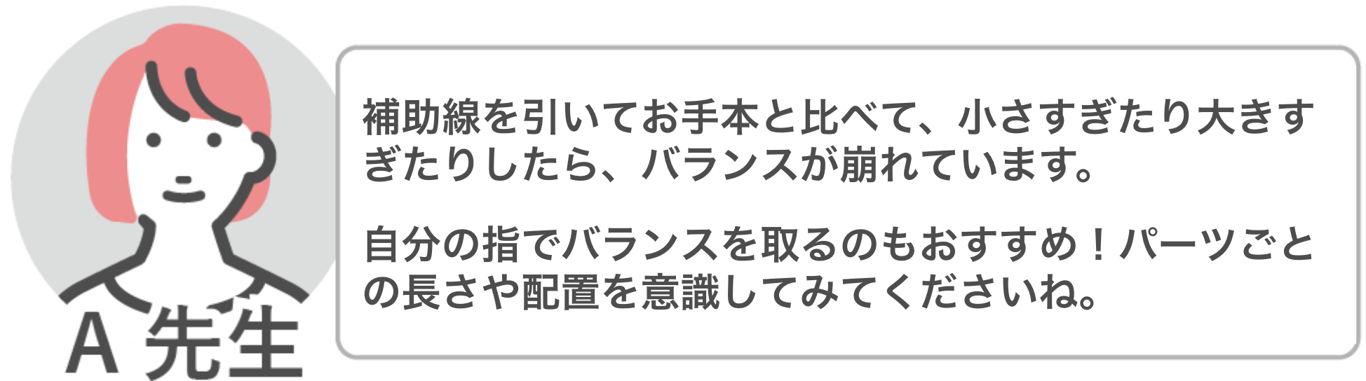 | Q3「目の位置や全身のバランスが崩壊します…」 | A3:補助線を引いてバランスを確認しよう! |