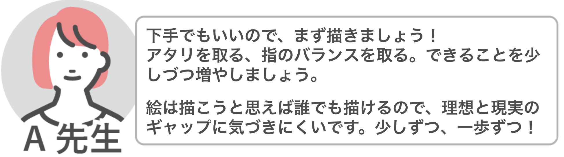 | Q1「棒人間レベルの絵しか描けないです…」 | A1:お悩みレベル別にやることを変えよう! |