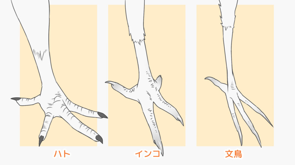 ハトのような走り回る種類より足が細く、飛びやすくするために軽量化されています。