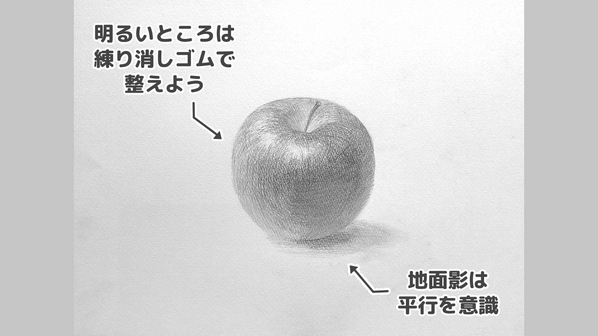 最初から筆圧を強く描きすぎてしまうと紙に鉛筆が乗らなくなり、練り消しゴムで消しにくい状態になります。 だんだん筆圧を強めていく意識で手を入れましょう。