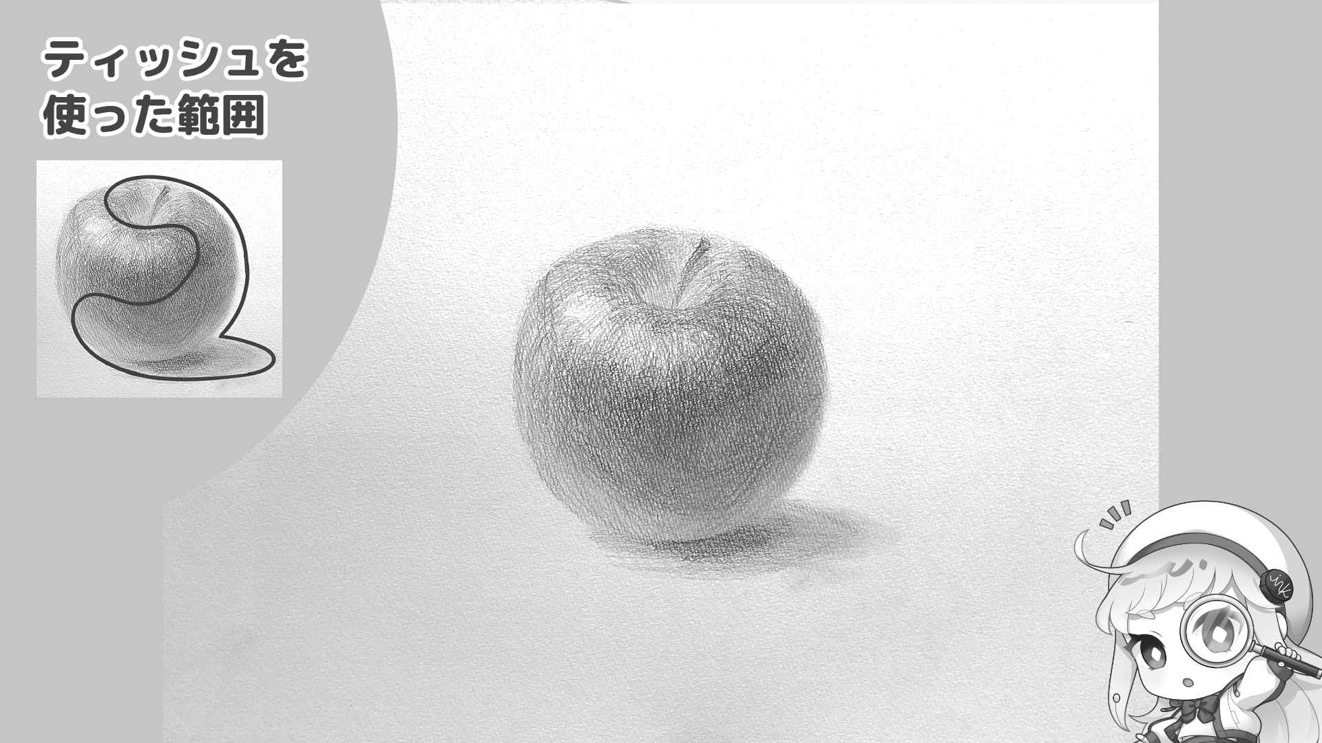 また、練り消しゴムは白の鉛筆だと思って光の表現にも使用します。 ハイライトの部分も描画してみましょう。