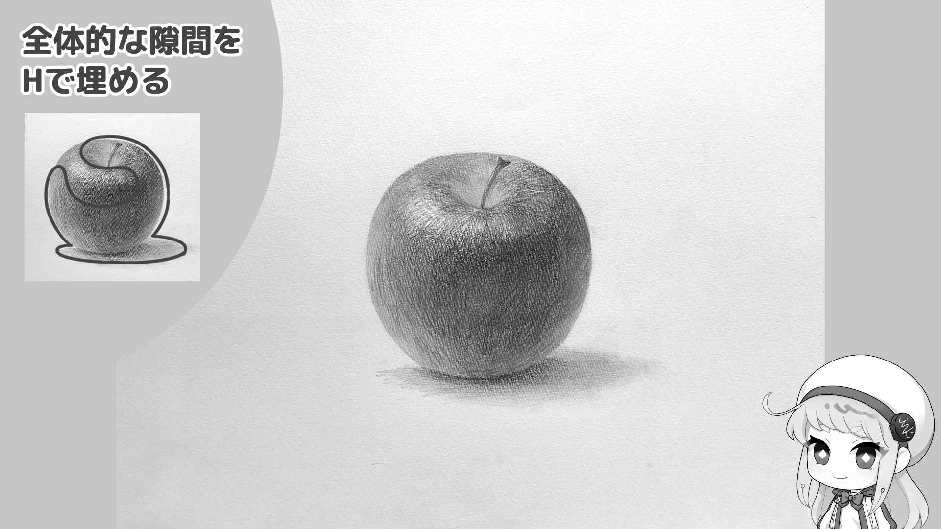 リンゴのツブツブや筋などの模様を仕上げに描き加えます。 ツブツブは練り消しゴムを尖らせるように変形させて模様の部分を消して表現しています。