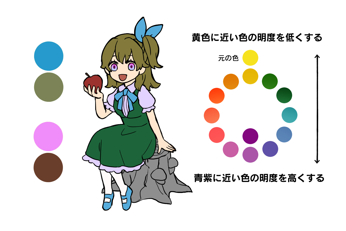 最暗色は線画に、最明色は光源やイラスト内の重要な部分に使いましょう。明るい場所や暗い場所を描くときは彩度の低い色を使い、中間色の彩度はイラストのメインとなる色になるので最も高くする事をおすすめします。